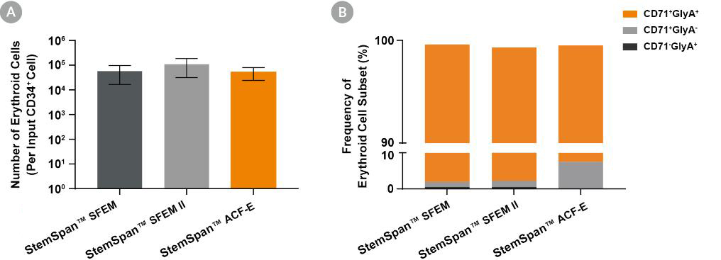 · ACF-E培养基仅包含重组和合成成分,且是市面上唯一一款ACF级别的用于CD34+细胞红系分化的培养基。