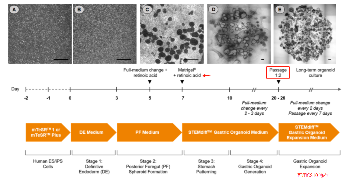 (E)根据需求,可使用 STEMdiff™ Gastric Organoid Expansion Medium 扩增胃类器官用于下游应用或用CS10冷冻保存以备将来实验。